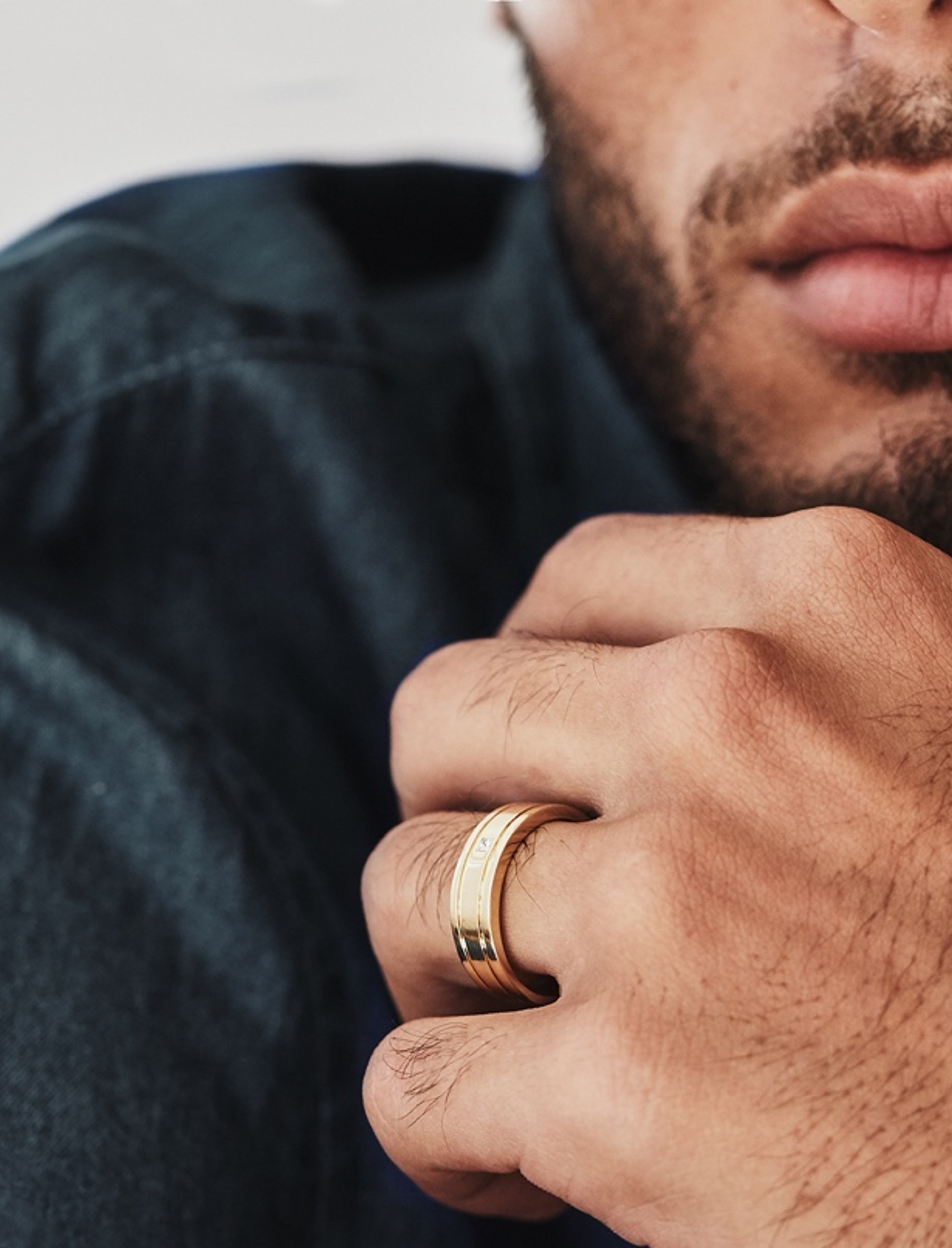 A broader band style featuring line and Diamond detail with complimentary engraving.